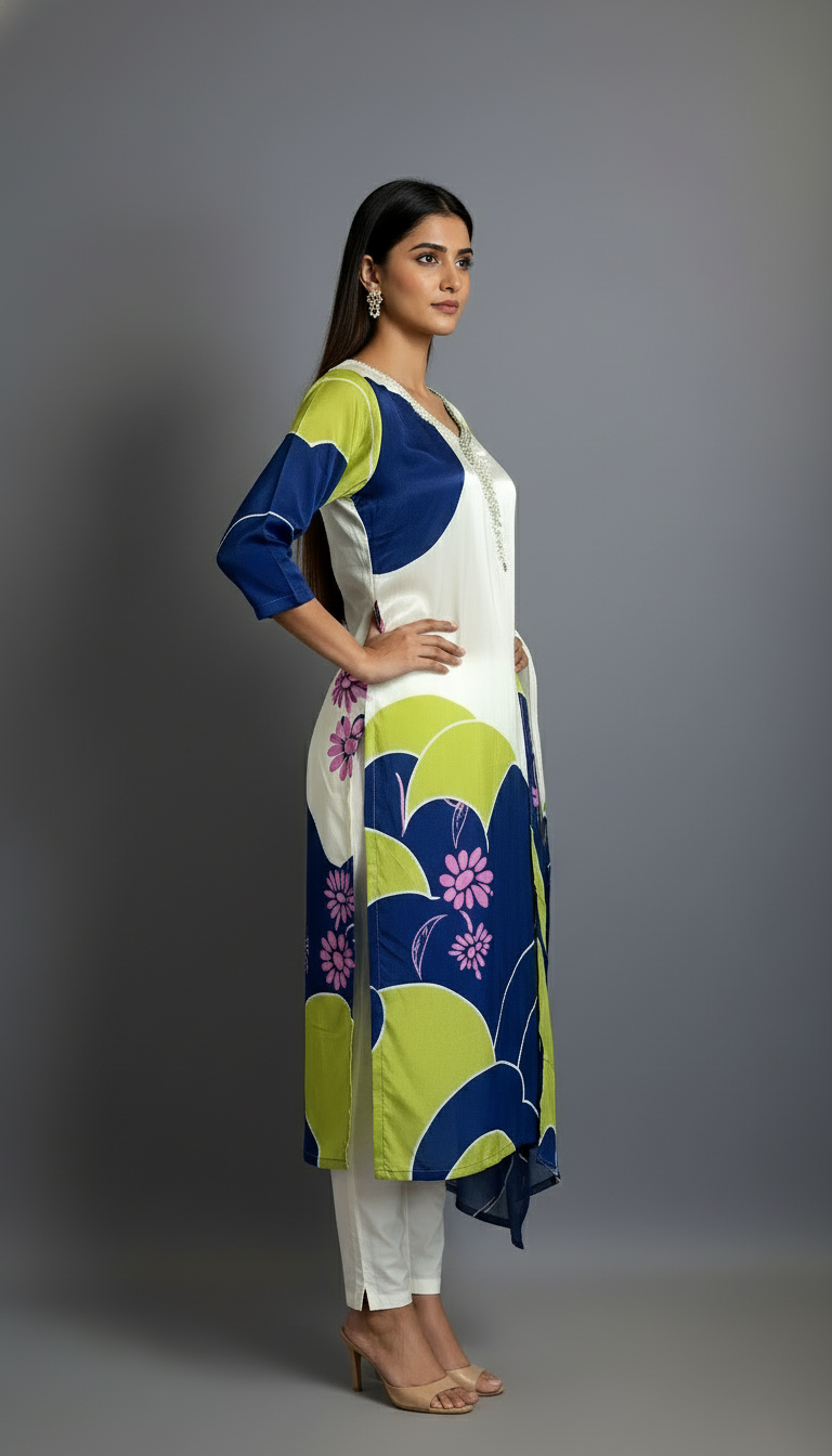 White kurta set with blue and green abstract design. This kurta set is perfect blend of elegance and artistic flair. The base fabric is pristine white, serving as a canvas for striking blue and green abstract patterns.